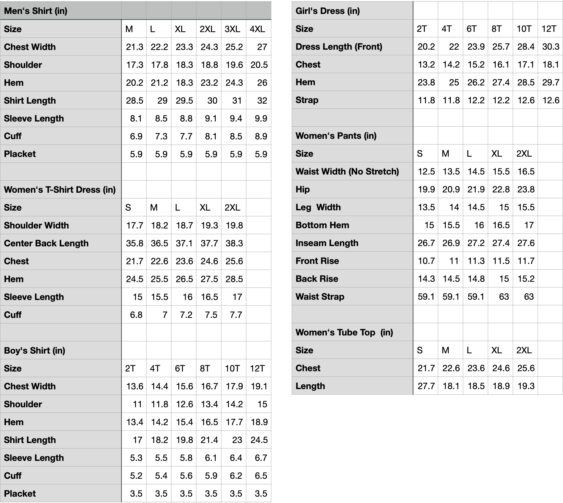 Our sizing chart is designed to help you find the best fit for comfort and confidence. Measurements are taken flat and listed in inches. For the best fit, we recommend comparing the measurements to a similar garment you already own. If you’re between sizes, sizing up will provide a more relaxed fit.